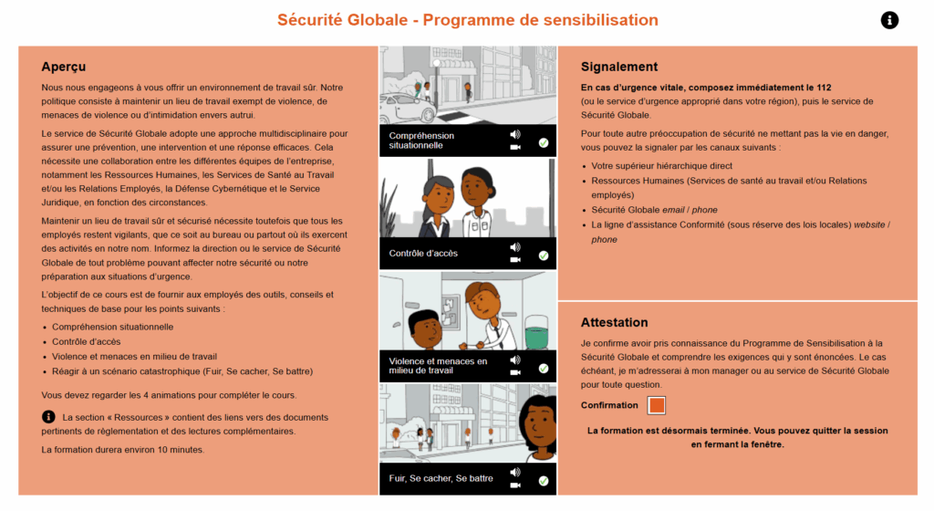 Cette formation d’une durée d’environ 10 minutes est personnalisée selon votre programme. Elle sera mise à disposition sous format SCORM sur votre LMS (Learning Management System).